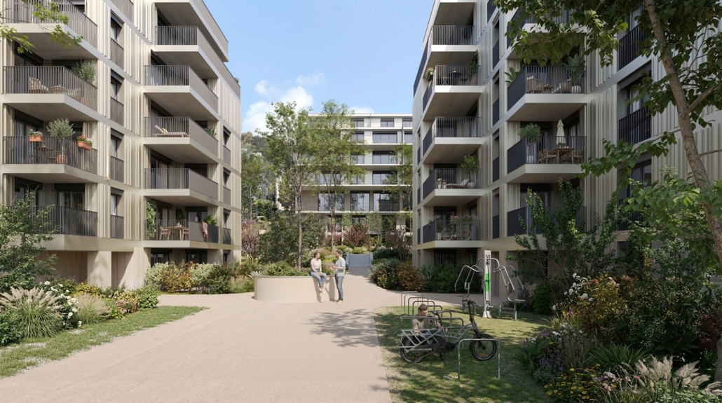 De plus, une stratégie de circularité tient compte des possibilités de réemploi et de transformation ultérieures, et du recyclage des matériaux en fin de vie. Une production d’électricité propre avec des panneaux photovoltaïques et une consommation directe est planifiée. Enfin, aucune énergie fossile ne sera utilisée pour le chauffage des immeubles.