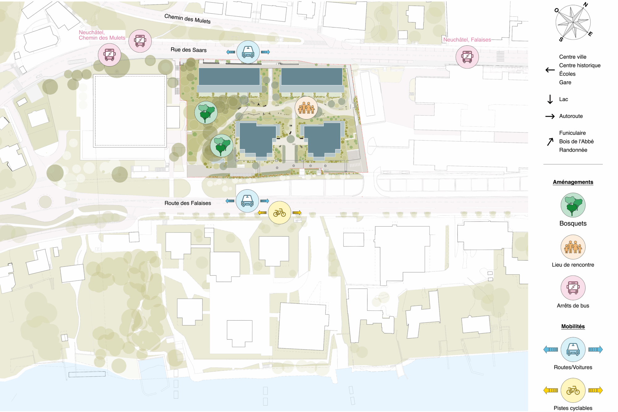 Les espaces partagés et les différentes typologies de logements offrent flexibilité, confort et efficacité, pour répondre aux besoins individuels et collectifs de ses futurs habitants. Le quartier bénéficiera également de la proximité immédiate d’écoles, de structures d’accueil pour les enfants et de divers services facilitant le quotidien des habitants. Les loyers seront alignés selon les standards en ville de Neuchâtel.